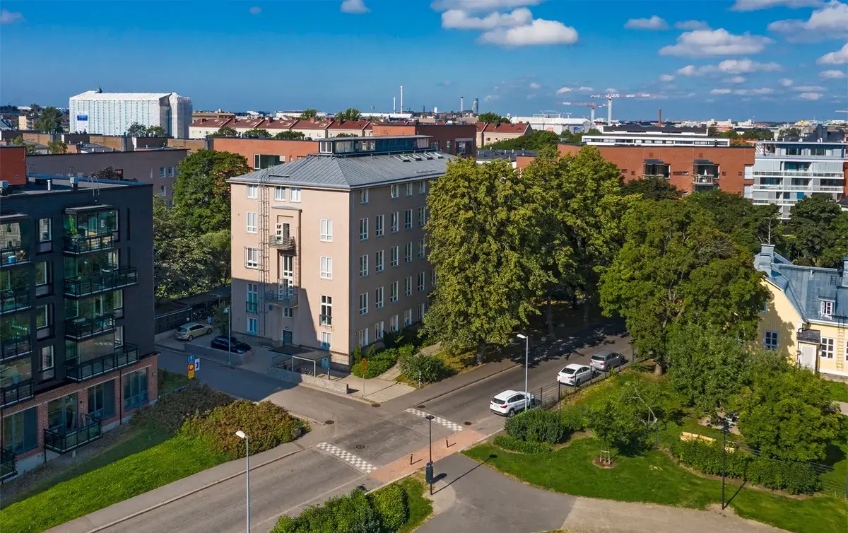 Kiinteistö sijaitsee puiston reunalla, kauniiden villiviiniköynnösten koristamassa punertavassa kerrostalossa. Eläinlääkärinkatu 3:een on helppo tulla: metroasemalle kävelet n. 10 minuutissa, raitiovaunu pysähtyy lähes oven eteen ja bussikin hurauttaa ohi parin sadan metrin päästä. Kadunvarsipaikkoja löytyy myös niille, jotka saapuvat autolla.