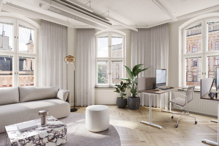 Tilojen korkea huonekorkeus, suuret ikkunapinnat ja historiallisen rakennuksen yksityiskohdat luovat arvokkaan ja inspiroivan työympäristön. Jokainen kerros on luonteeltaan omanlaisensa, ja rakennuksen kerroksellinen historia näkyy hienovaraisesti sekä julkisivussa että sisätiloissa. Kokonaisuus sopii erityisesti yrityksille, jotka haluavat profiloitua laadukkaan, persoonallisen ja keskeisen toimistoympäristön kautta.