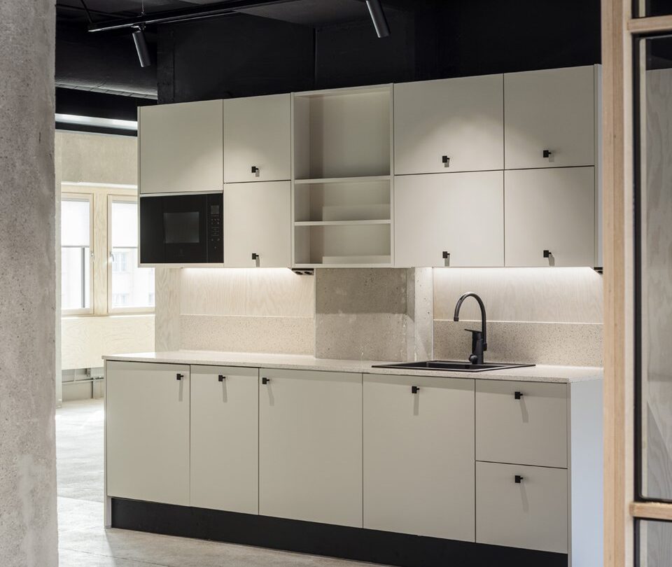 Haikun tiloille on ominaista selkeä arkkitehtuuri, harkitut materiaalivalinnat ja rauhallinen, rytmikäs tunnelma. Peruskorjauksessa on vaalittu rakennuksen alkuperäisiä vahvuuksia ja tuotu ne osaksi modernia työympäristöä. Lopputulos on ajattoman minimalistinen ja samalla lämmin – tila, joka tukee keskittymistä, yhteistyötä ja yrityksen kasvua. Yleisten tilojen ilmeessä yhdistyvät skandinaavinen selkeys ja japanilaisesta estetiikasta ammentava japandi-henkisyys, joka näkyy niin materiaaleissa kuin mittasuhteissakin.