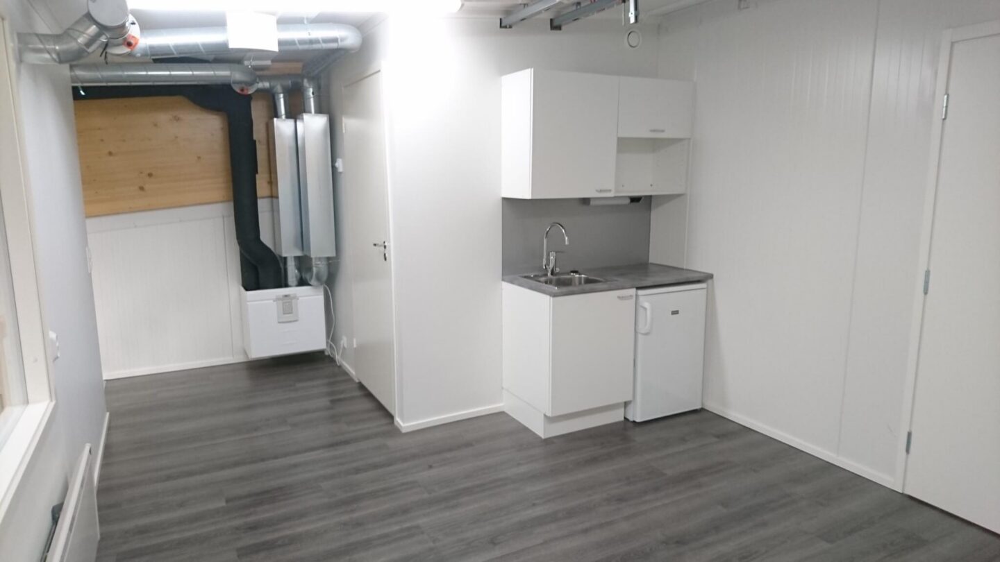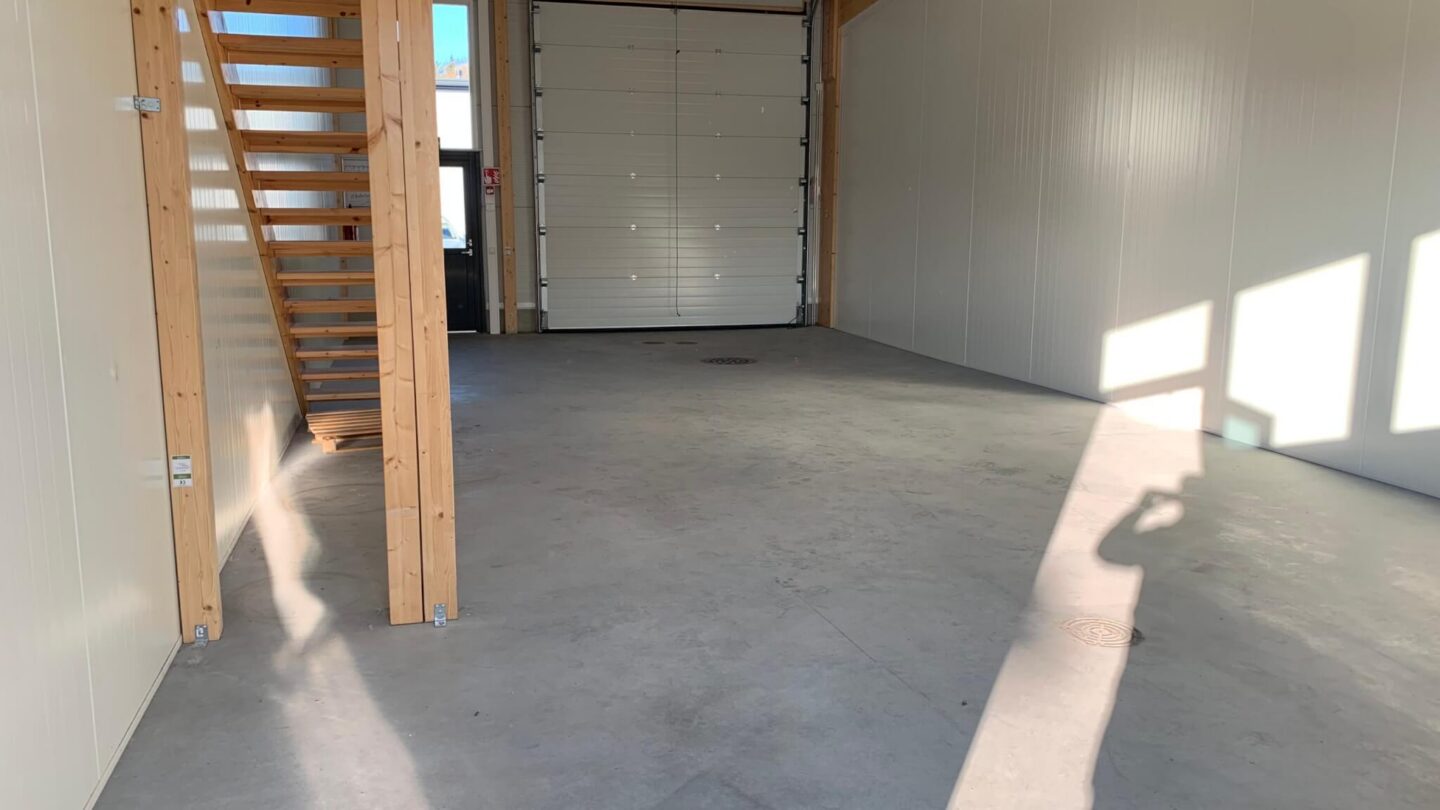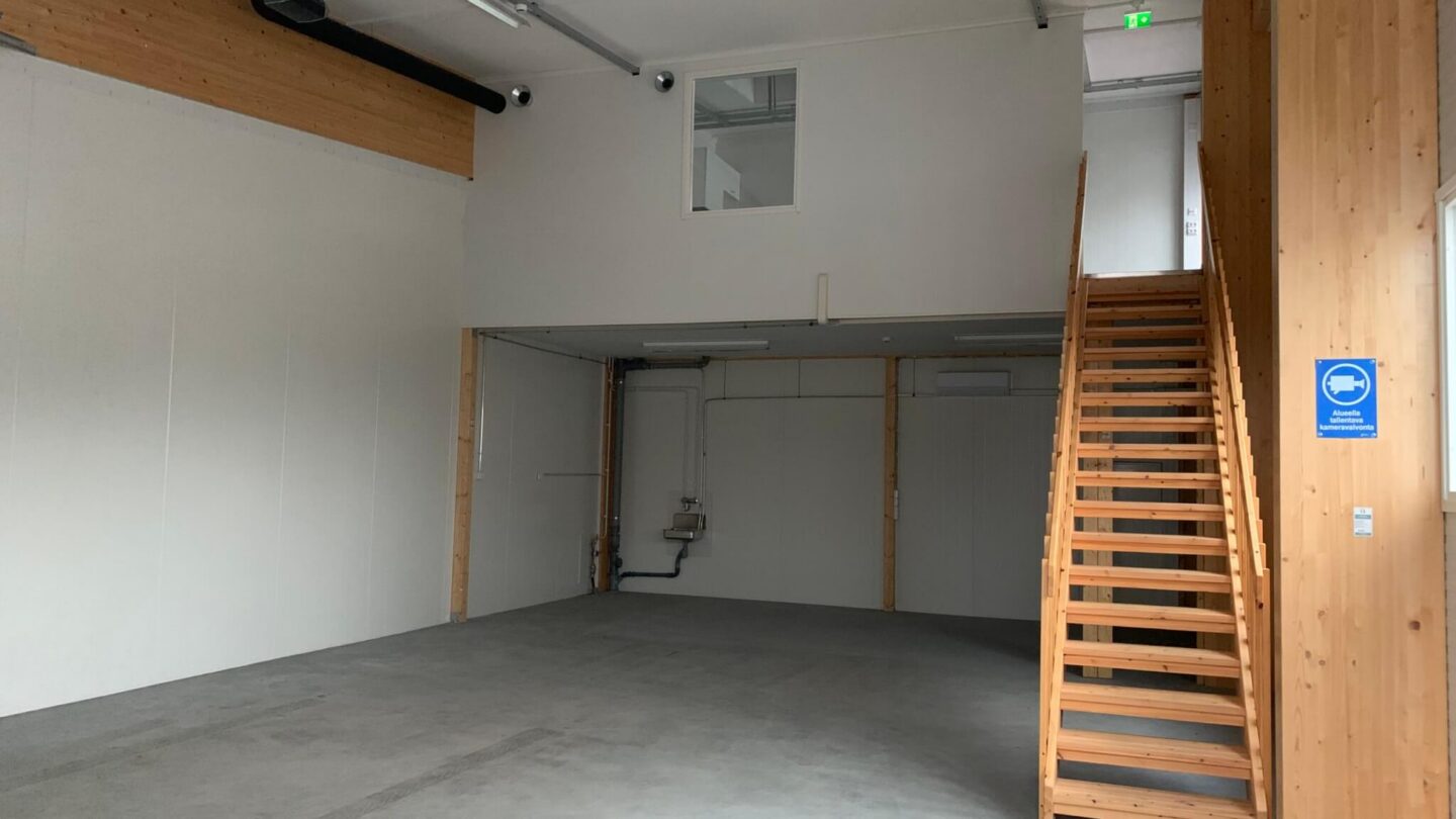 Tiloissa yhdistyvät käytännöllisyys ja tehokkuus. Katutasossa sijaitsee varsinainen työtila, johon on suora sisäänajo oman nosto-oven kautta. Yläkerran toimistoparvi tarjoaa lisätilaa hallinnolle tai taukotilaksi, ja sieltä löytyy myös oma keittiö sekä suihku- ja wc-tilat.