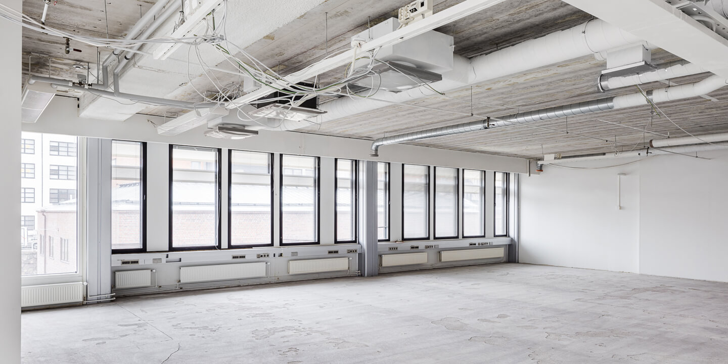- 66 m² – 2. kerros (tila 205): Muuttovalmis tila, kaksi huonetta ja avotilaa. Isot ikkunat. Vieressä yhteiskäyttöiset keittiötilat.